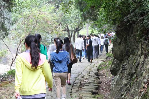船这时间已经行使到了一片长满水葫芦的狭窄水面,,,,,,绿油油的水葫芦盖住了游轮的前进偏向,,,,,,船也最先靠岸了。。。。。。。。我们下船上了岸,,,,,,岸上是一条由水泥铺成的平展的路,,,,,,路面也很宽,,,,,,一直通向前方。。。。。。。。我们约莫走了三、四里路,,,,,,山路最先陡起来了,,,,,,溪水也变的很湍急。。。。。。。。当我们爬上一个小山包时,,,,,,我们的眼前突然泛起了一条从天而降的水帘,,,,,,高约百米,,,,,,水柱飞入一口碧玉般的水潭里。。。。。。。。在水潭边上有一块平如磨刀石的玄色石头,,,,,,上面有鲜红的“葫芦飞瀑”四个大字,,,,,,各人纷纷在这里照相留念。。。。。。。。时间到了中午,,,,,,我们上船就中餐后,,,,,,搭船返回。。。。。。。。
