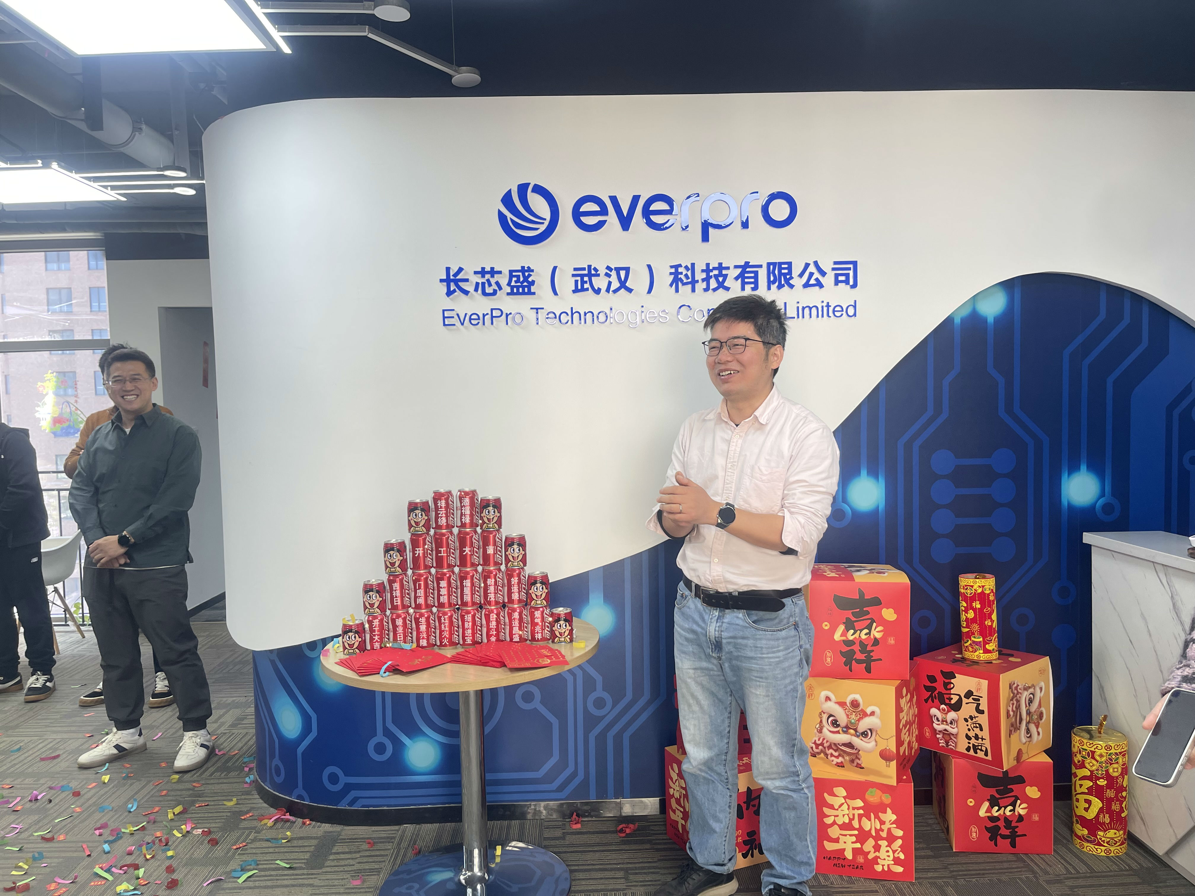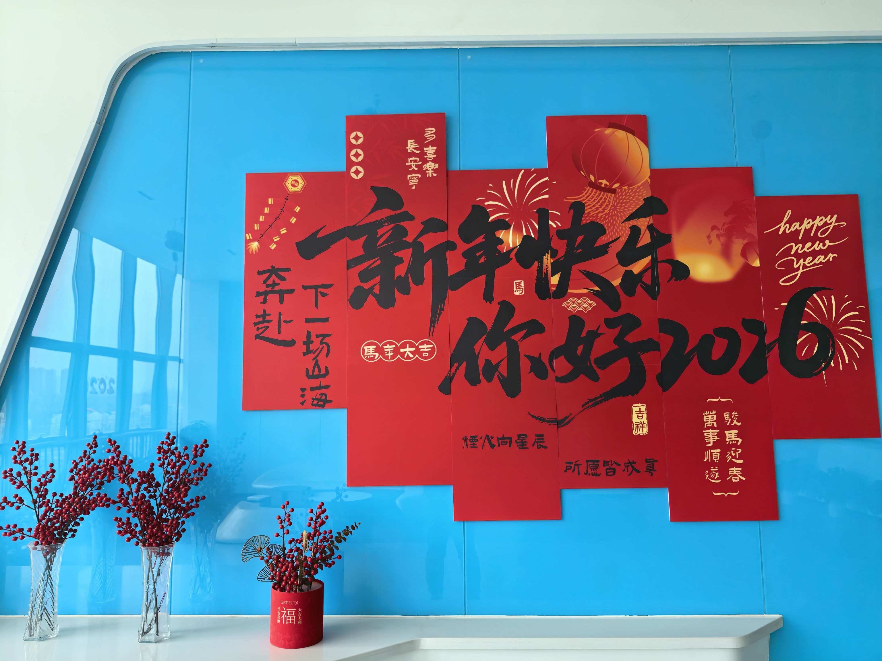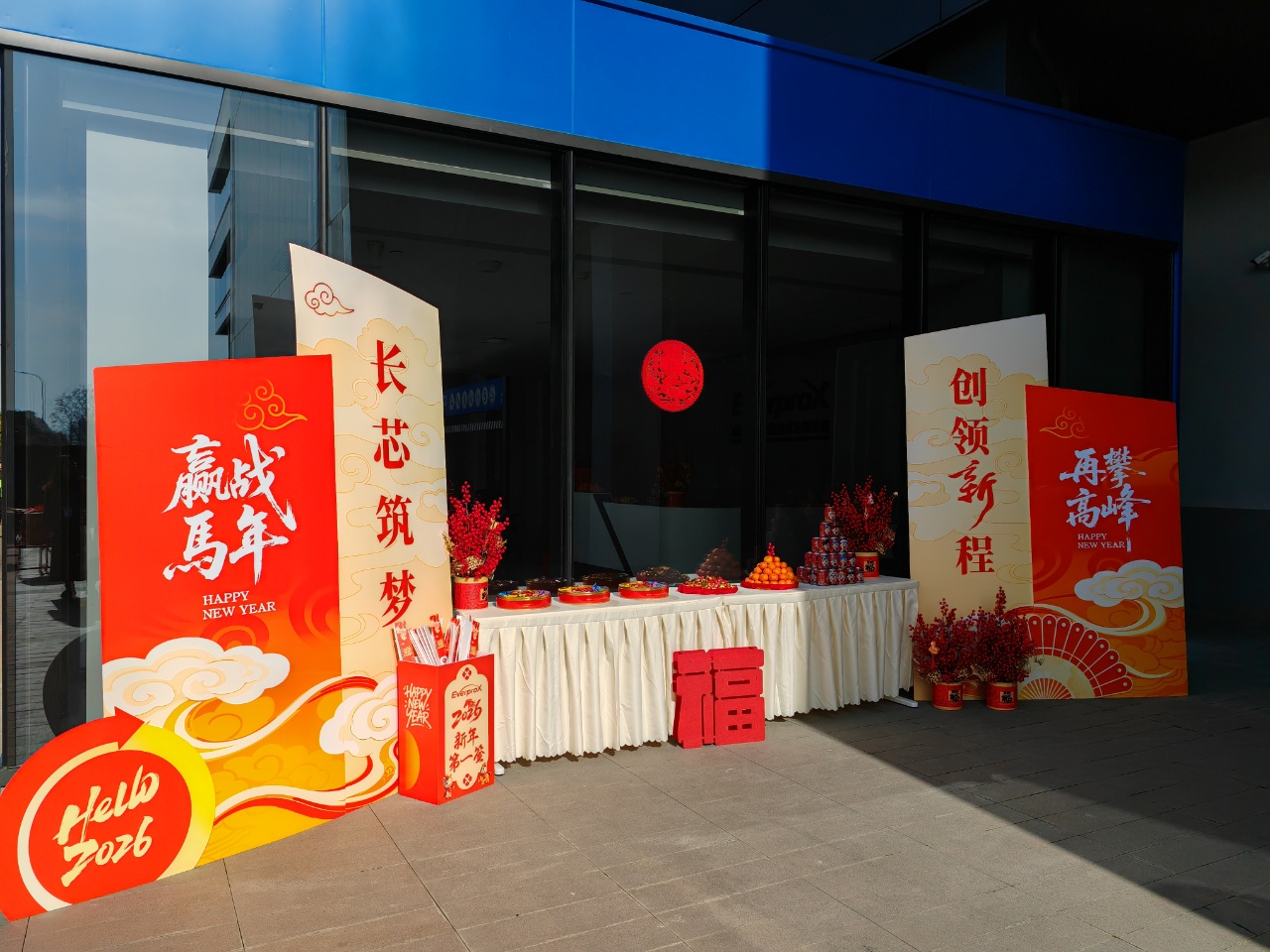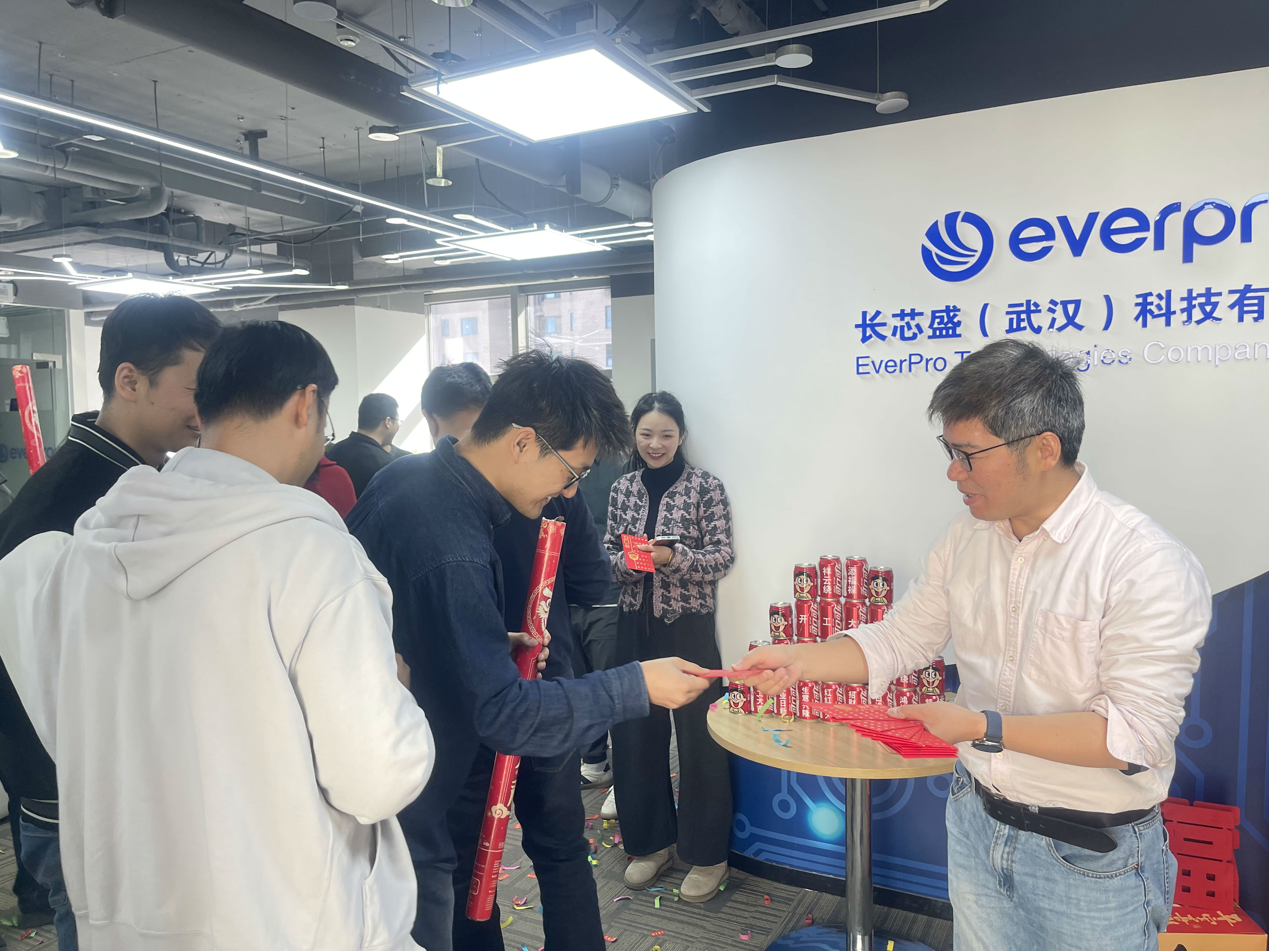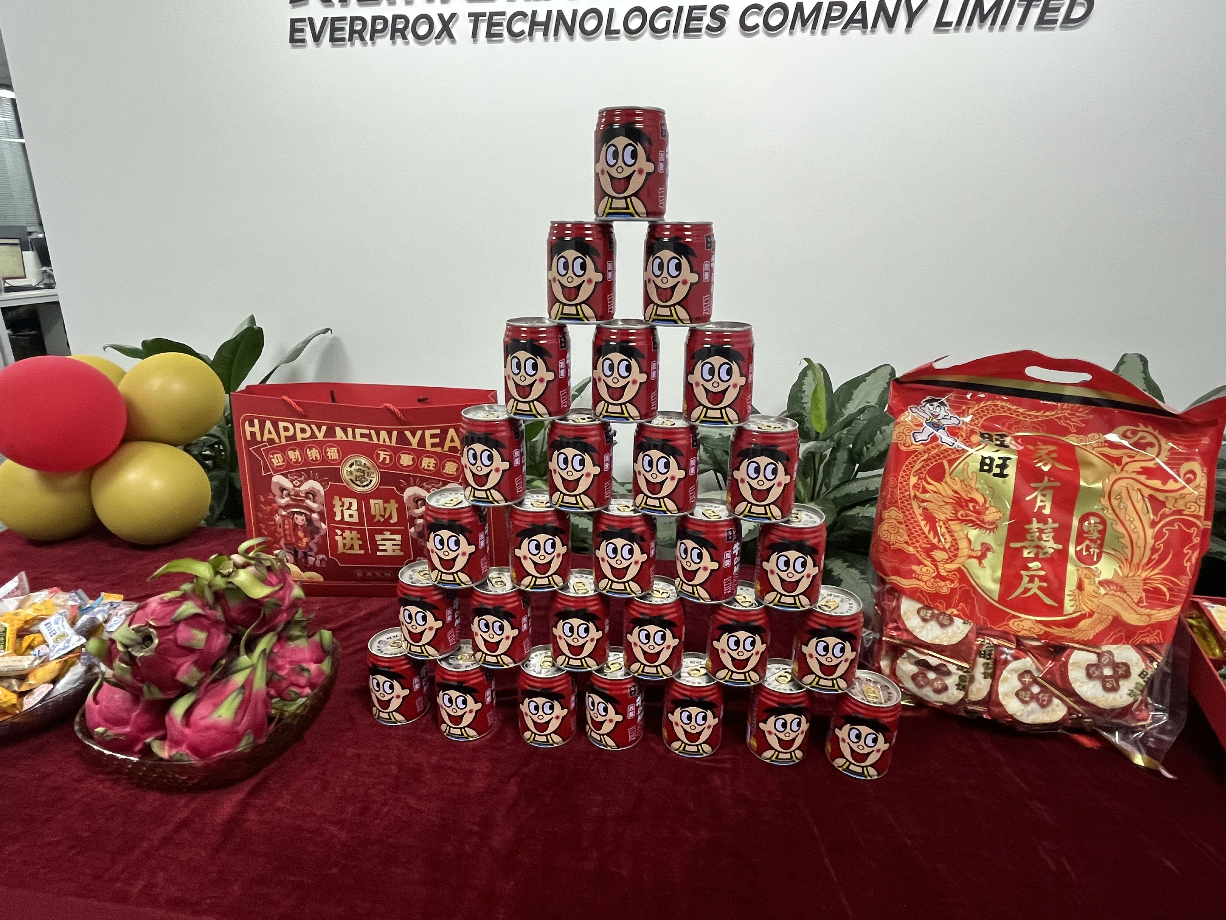 办公区与聚会室被红绸、气球装点得喜气洋洋。。。。。。。。礼炮声声,,,,,彩带飞扬。。。。。。。。 茶歇区摆满水果、糕点、糖果、礼物,,,,,同事们互道祝福,,,,,现场欢声笑语一直。。。。。。。。